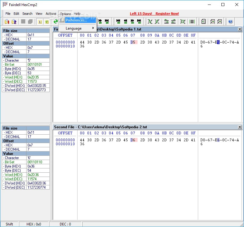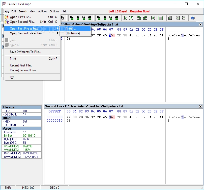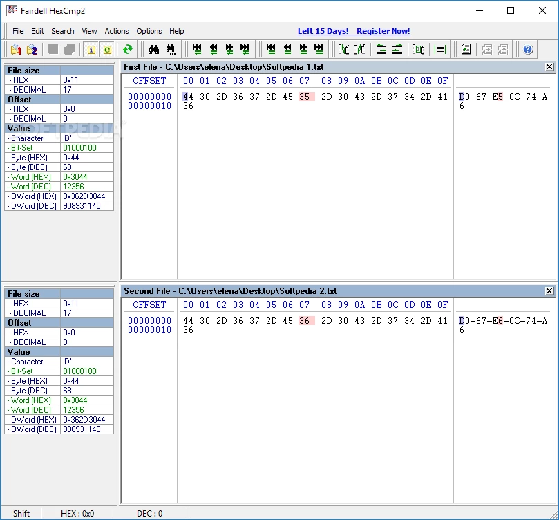 The interface is simple and offers quick navigation for different functionalities. Unfortunately, the Drag & Drop feature isn’t supported, so you have to use a file browser to open any file. The unfamiliar values are highlighted in red color in both files; simply click the value available in the hex code to take out useful info i.e. hexadecimal and decimal value, corresponding characters, DWord, and bit set.
